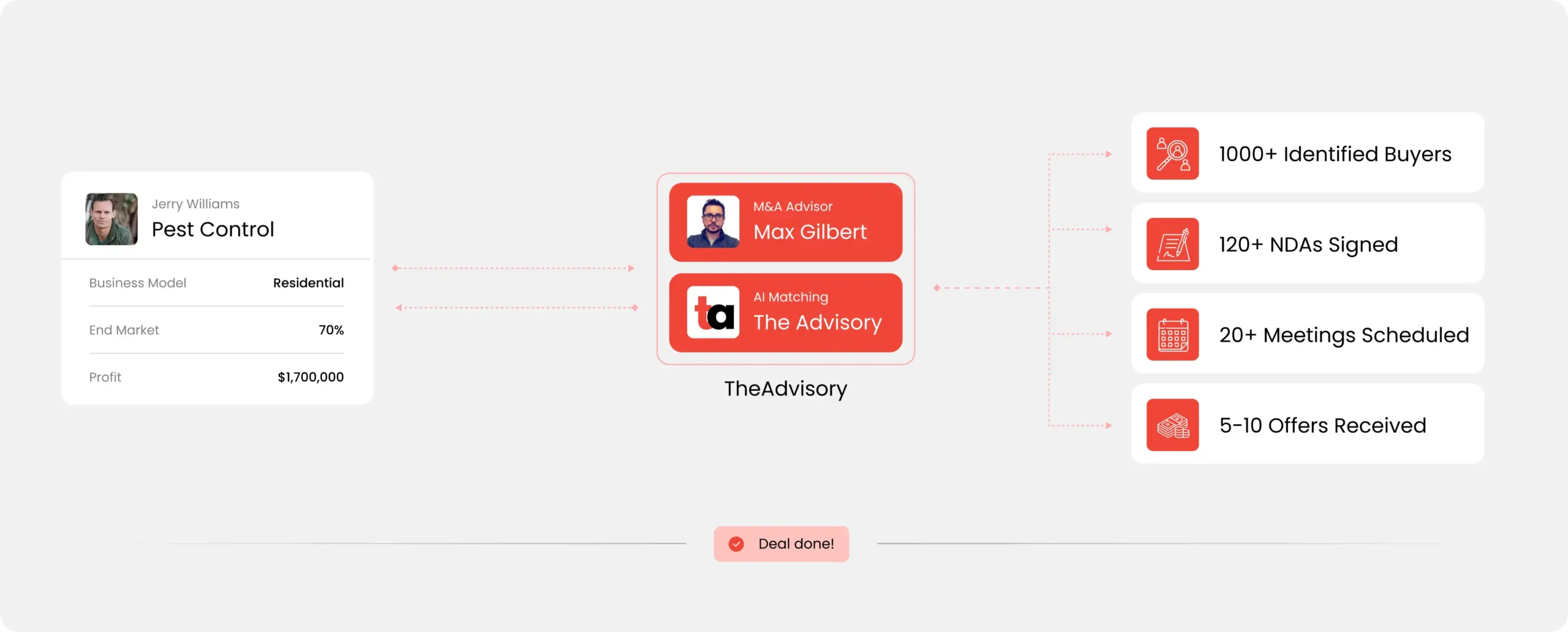 We operate on a 100% success-based model—no retainers, no upfront fees, no surprises. You only pay us when your deal closes. It’s that simple. Our incentives are fully aligned with yours from day one.